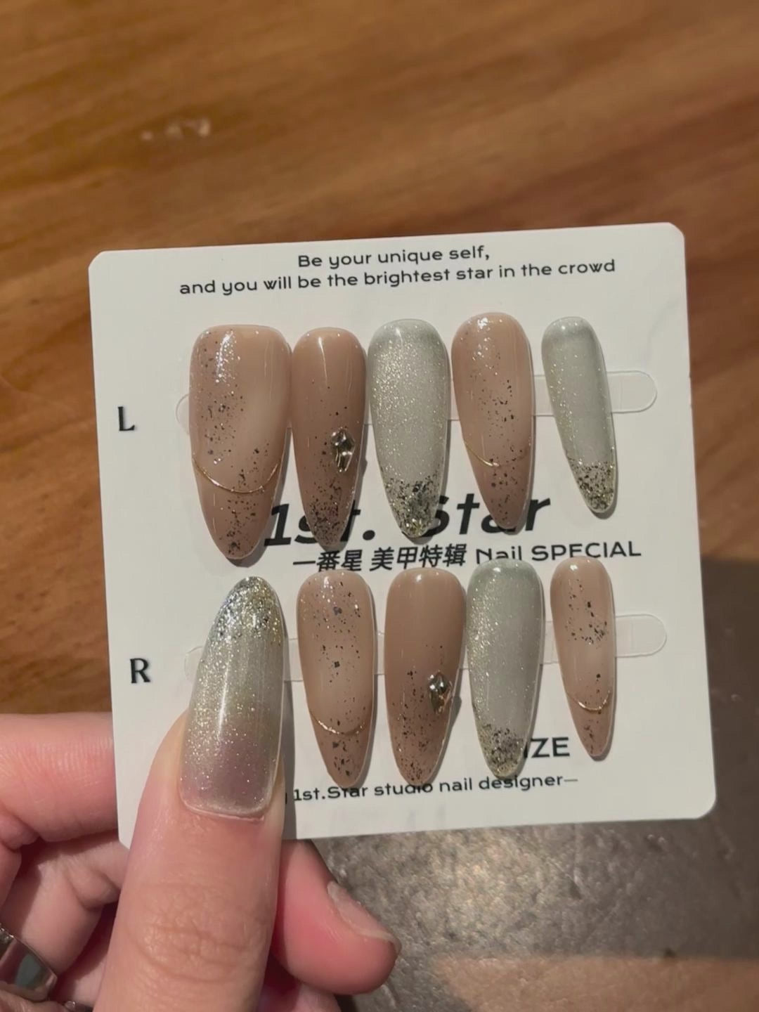 "Discover the luminous allure of Radiant Harmony Nails, a press-on set that brings a symphony of sparkle to your fingertips. This exquisite collection features a gradient of shimmering gold to rich bronze, designed to catch the light and captivate the eye. Perfect for those who appreciate a touch of luxury and elegance in their everyday style."